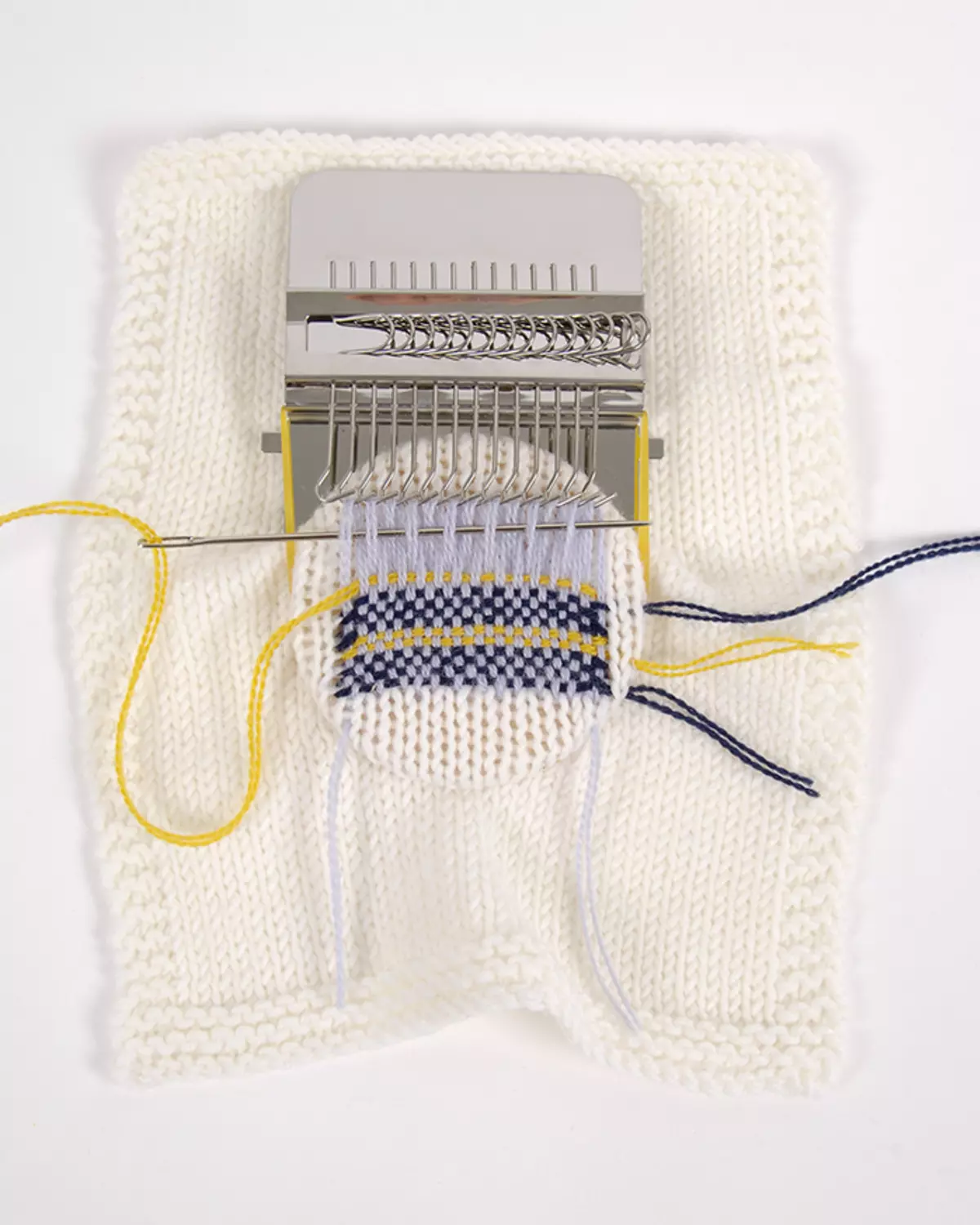 Pakken inneholder selve veven, trestykket til oppspenning, strikker, en vevnål og bruksanvisning.